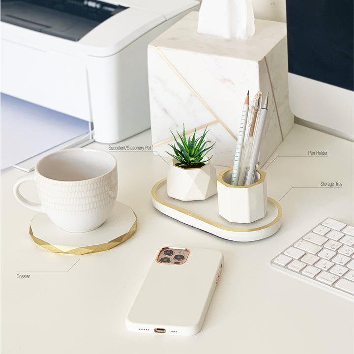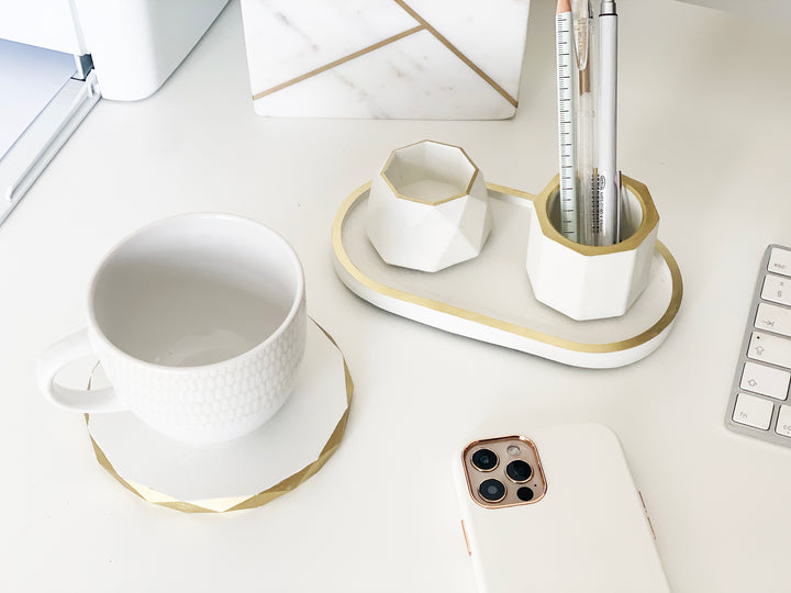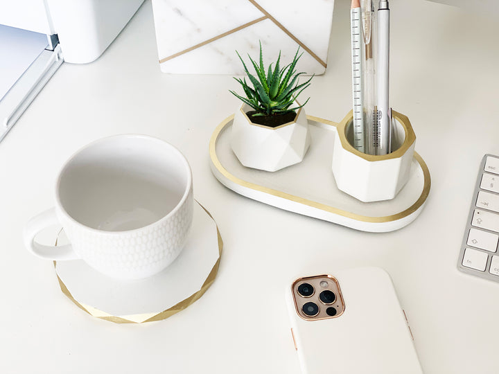 Our White and Gold Desk organizer has an organic feel with gold painted edges. This set comes with a tray, a pen holder, a succulent pot and a coaster. The succulent pot can also be used for storage of paper clips or other stationery. Our desk organizers are handmade and hand painted. Note: Plant, phone case and tissue box not included.